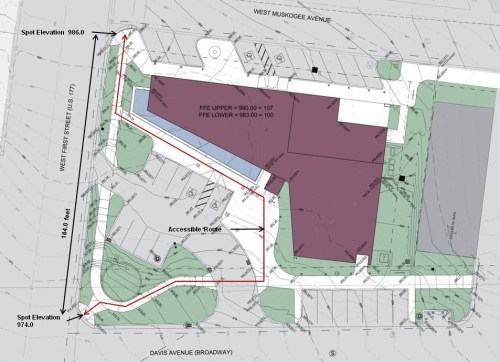 Our site is more than challenging with the drop in grades along the west property being 12 feet in 184 feet; a grade of 6.5%. The existing contours of the site can be seen in the graphics that are a part of the blog post “The Site.” The west property line is also adjacent to state highway 177 and therefore under the jurisdiction of the Oklahoma Department of Transportation. One of the requirements when providing pedestrian access along the street is that you must also provide an accessible route from intersection to intersection. Maximum accessible grade is 1 foot in 20 feet or 5%. Where grades are not less than 5% handrails must be provided. However, the accessible route does not need to run along the property line adjacent to the street.