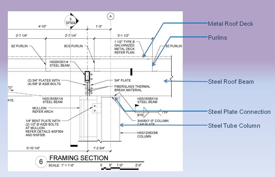 At the top of the column, there is a connection to an 8” wide by 16” deep tube-shaped roof beam. There is an 8” by 12” cap plate welded to the top of the column which in turn is welded to the bottom of the beam. Sitting on top of the roof beams are 8” deep purlins that span from beam to beam. The purlins are fastened to the beams and the metal roof deck which creates the lid to the building is fastened with screws to the purlins.