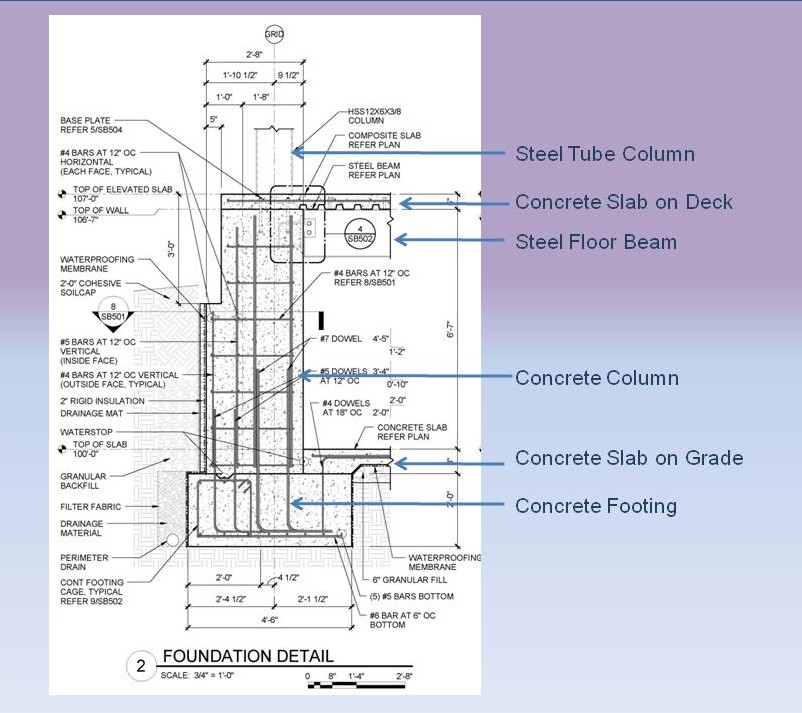 It starts with the concrete footing upon which is setting a concrete column engaged into the below grade cast-in-place concrete retaining wall. The footing, concrete slab on grade, concrete retaining wall and column are all connected together with reinforcing steel bars that can be seen in the foundation detail. At the top of the wall there are 2 connections. The one to the right the column is a wide flange beam about 6” wide and 12” deep. It’s connected to the concrete column involves a number of pieces; an embed steel plate that is cast into the concrete, steel clip angles that are welded to the embedded plate and finally the beam is bolted through holes in the end of the beam and clip angles. The beams are holding up the floor slab of the Gallery which is concrete on metal deck that is connected to the beam by a composite slab design.