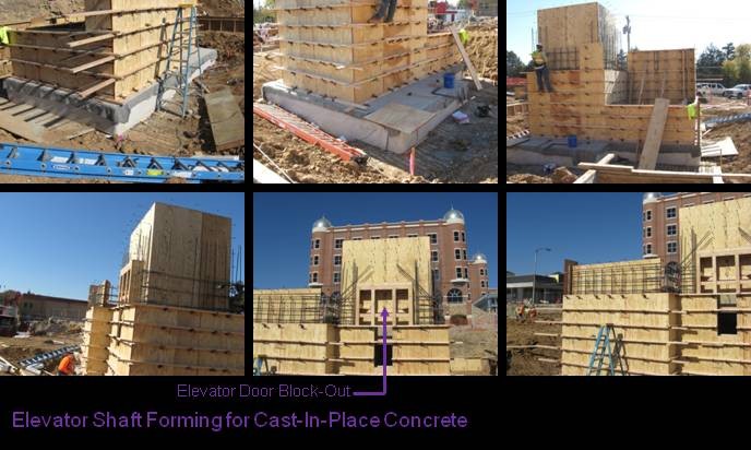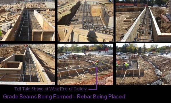 The photos at the top provide a panoramic view of the progress of construction on the site. The elevator is the tallest element in the center of the site. The elevator is surrounded by the perimeter footings being formed on the west, north and east sites of the mechanical crawl space.