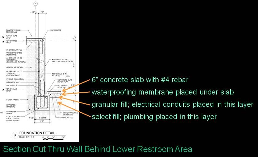 The following structural section is a vertical cut through the wall that is just behind the restrooms in the lower office area. It shows the contractor the various layers from the sub grade up to the lower concrete slab on grade as well has how they integrate with the footing, vertical retaining wall and the upper slab on grade. I have noted where the underground plumbing and electrical systems are typically integrated into the layers.