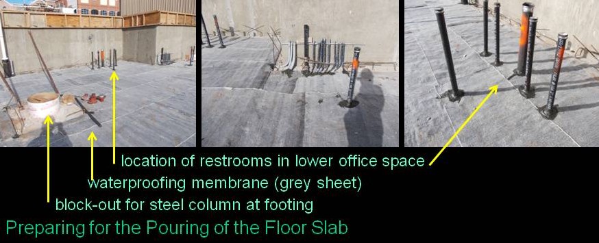 If you recall, following the rough excavation of the site, the construction documents call for existing grade to be cut 2 feet below the floor areas and replaced with select fill. The under floor plumbing is trenched and placed within this layer of fill. The plumbing lines are then stubbed up through the concrete slab in the proper locations prior to the concrete slab being poured. Within the lower floor slab where the lower office space is located there are some areas of concentrated plumbing. There are waste lines serving two bathrooms and a shower room. Each restroom has a toilet and a sink. The shower room has a sink and a shower. The plumbing subcontractor must accurately locate the fixtures so that the plumbing lines stub up in just the right location. This is a bit of a challenge considering there won’t be any walls in place for a long time; I’m not sure how they pinpoint things so accurately at this stage. In order to meet code, each toilet must be within inches of being in the right location in relation to the finish walls for proper ADA design.
