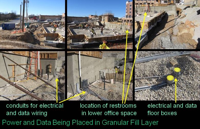 The following series of photos shows the sequential stages of construction where the underground plumbing and electrical is being installed. The first photos show the sub grade being prepared and where the lower office area will be located on the site.