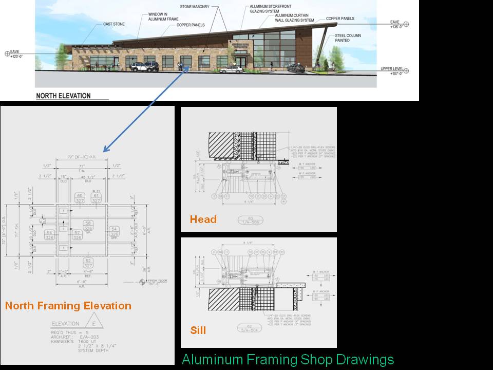 The above image shows the north elevation of the Visitor Center and the corresponding shop drawing submittals for the large area of aluminum framing.
