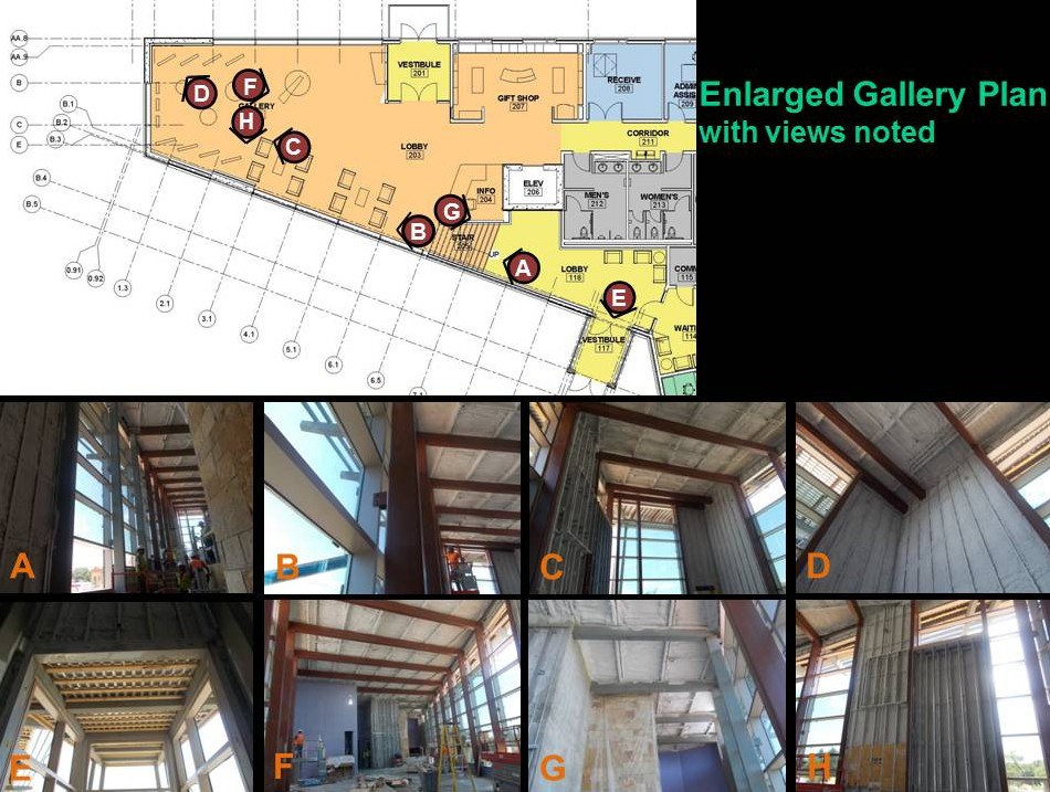 Below are recent photos showing the state of construction in the Gallery Area and Entry Lobby. The photos and the direction of the views are shown on the enlarged plan. The curtain wall with its glass is easily recognizable as you catch views of the exterior surroundings. The exposed structure of steel tube beams traversing horizontally and vertical steel columns are also easily picked out. The vertical steel wall studs are somewhat visible. The light gray material between the studs and on the underside of the roof deck is sprayed on foam insulation. It will eventually be covered up with surfaces of finish materials.