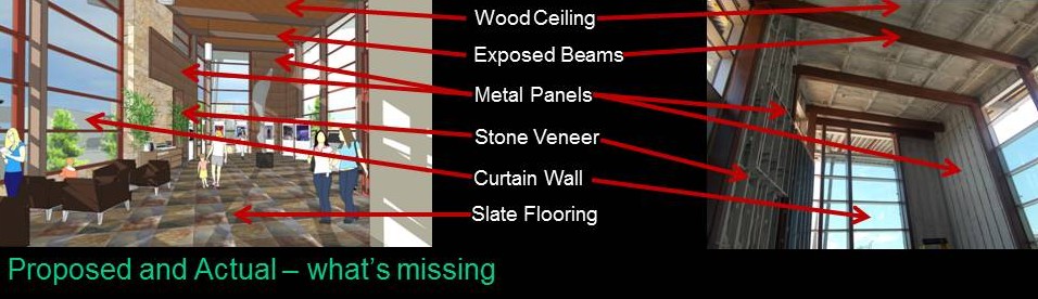 The proposed and actual photos above and below illustrate what we envision the finished space to look like versus the current state of construction. The finish materials that are left to be installed are pretty straight forward in their respective installation process with the exception that the tops of these walls and the ceilings areas vary from 15 to 20 feet above the floor. Installation will require scaffolding and/or scissor lifts to get it all in place. With the notes on the photos, you can get a sense of what materials go where and how much work there is to be done.