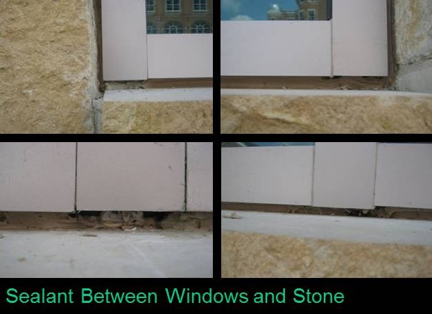 The gap between the windows and the surrounding stone is sealed with caulk. There is supposed to be a backer rod behind the sealant to give it something to be backed up to. The sealant should be neatly tooled to provide a continuous and clean joint profile.