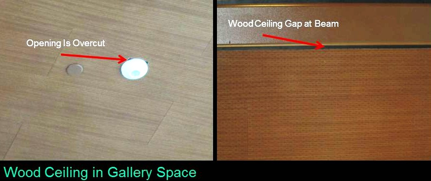 The wood ceiling in the Gallery area is an expensive material. Great care needs to be taken to neatly fit it to surrounding materials and to carefully cut openings for devices like smoke detectors that need to be incorporated into the ceiling.