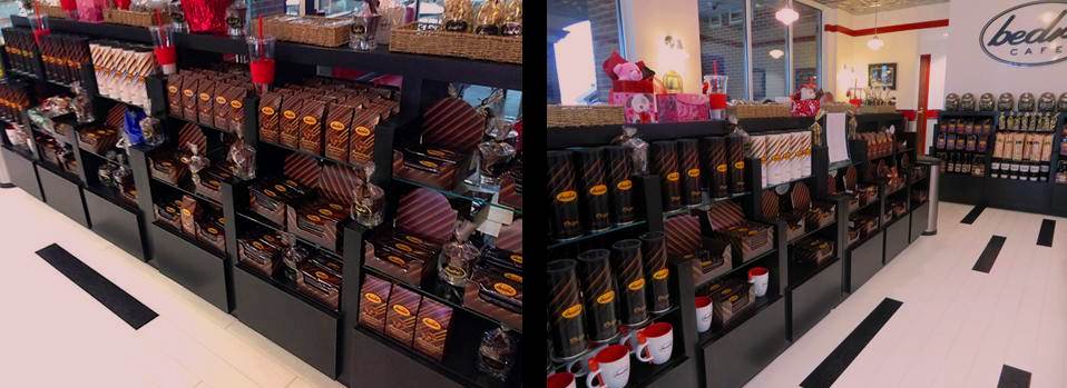 “OK. It’s a retrospect for Bedré chocolate. They thought of doing something different and doing a retro to the 40’s and 50’s. That’s how we came up with this [interior décor]. There are bar stools at the counter and booths lined along the opposite wall.