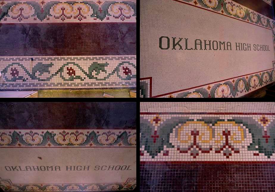 The historic elements on the 3rd level include the mosaic tile work in each of the 3 entrances. Most of individual tiles are as small as 3/8” square. The main high school entrance was on the east facing Robinson Avenue with secondary entrances on the north and south. The north and south entrances proudly announced Oklahoma High School in the floor bordered by detailed patterns tile. I took the following photos recently at the construction site and the tile has a light layer of construction dust. Imagine the brilliance of the tile when is cleaned.
